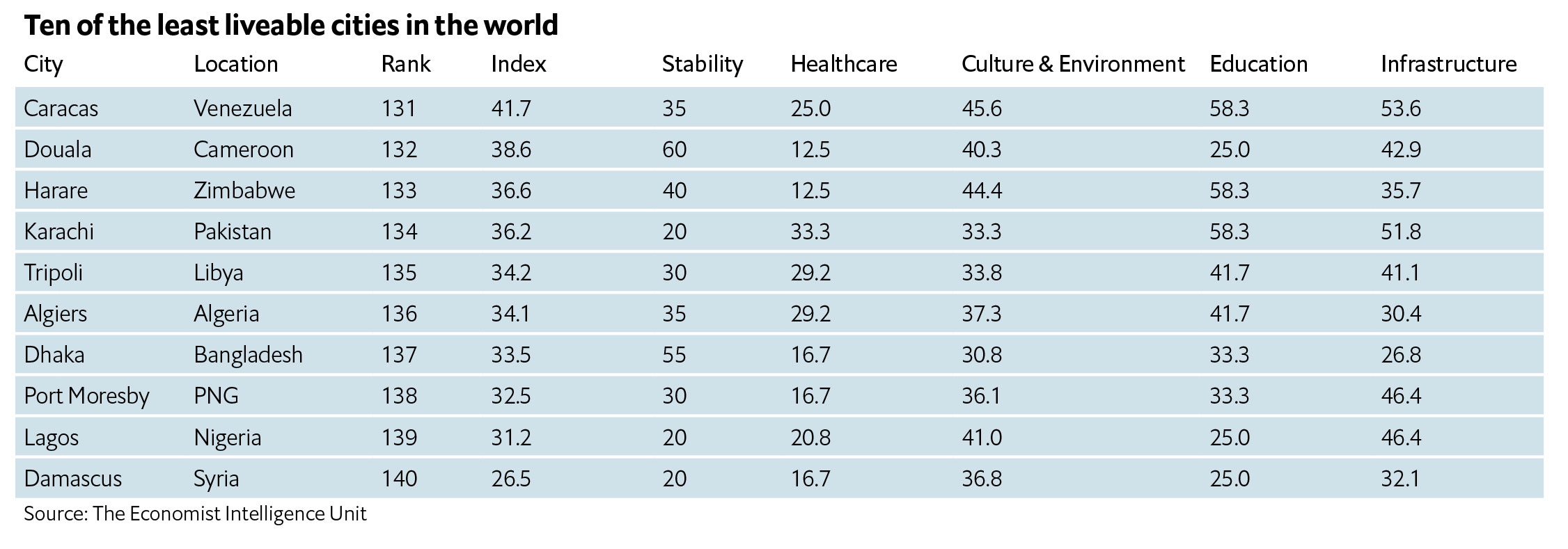 Qiymətləndirmə beş əsas meyara görə aparılıb: sabitlik, daha yaxşı səhiyyə xidmətləri, təhsil, mədəniyyət və əraf mühit və infrastrukturun səviyyəsi. Yaşamaq üçün “ən yaxşı” və “ən pis” şəhərlərin ilk 10-luğunun siyahısını təqdim edirik.