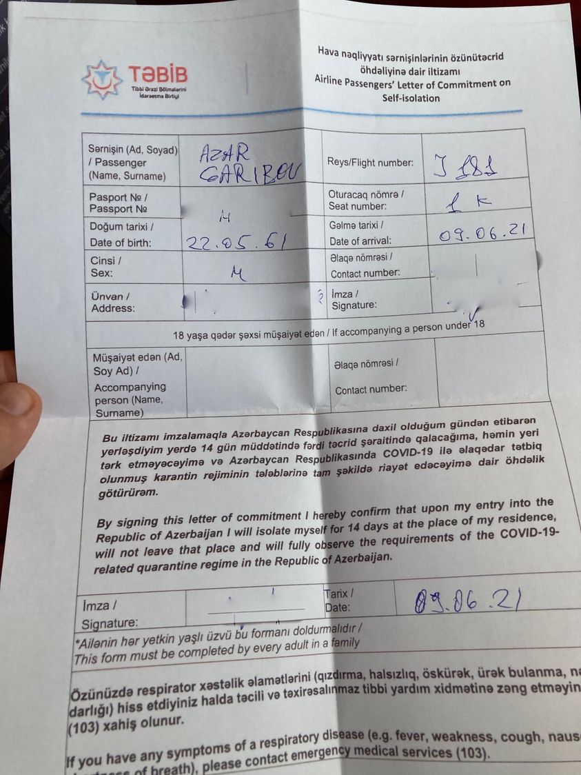 Bu barədə aparıcı-bloqer Azər Qərib feysbuk hesabında yazıb. O qeyd edib ki, bu sənədə imza atıb ölkəyə gələn hər bir kəs öhdəlik götürür ki, 14 gün özünü təcrid edəcək: