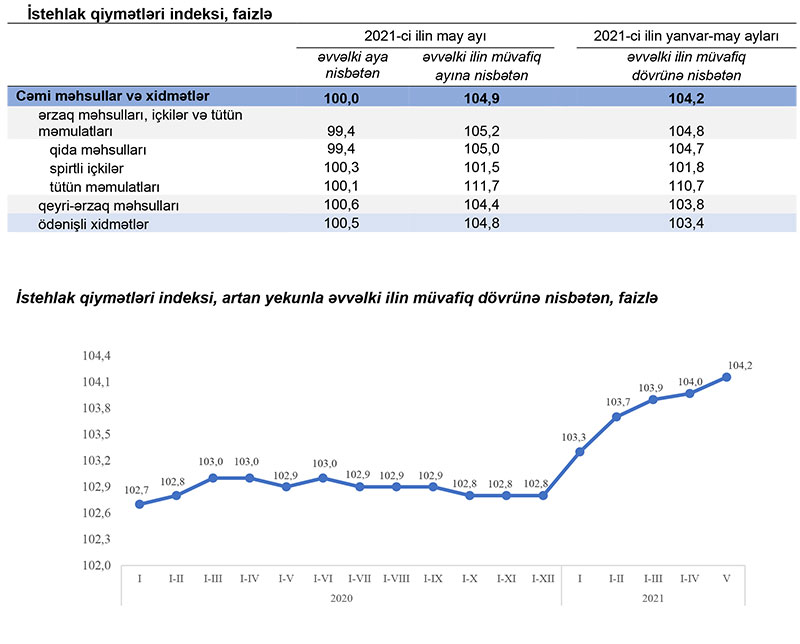 2021-ci ilin yanvar-may aylarında istehlak qiymətləri indeksi 2020-ci ilin yanvar-may aylarına nisbətən 4,2 faiz, o cümlədən ərzaq məhsulları, içkilər və tütün məmulatları üzrə 4,8 faiz, qeyri-ərzaq məhsulları üzrə 3,8 faiz, əhaliyə göstərilmiş ödənişli xidmətlər üzrə 3,4 faiz artıb.