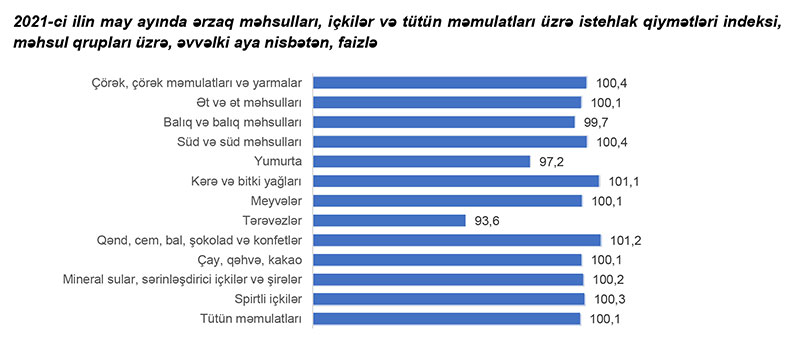 2021-ci ilin may ayında ərzaq məhsulları, içkilər və tütün məmulatları üzrə istehlak qiymətləri indeksi əvvəlki aya nisbətən 0,6 faiz düşüb, əvvəlki ilin may ayına nisbətən 5,2 faiz artıb.