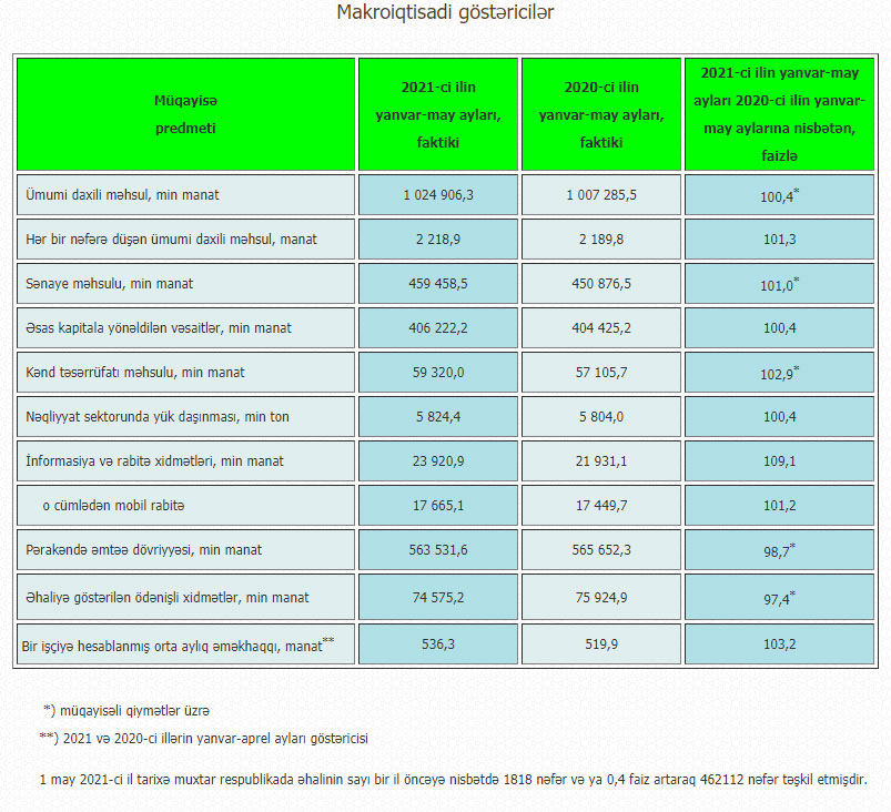 Naxçıvan Dövlət Statistika Komitəsindən verilən məlumata görə, cari ilin ilk beş ayında Naxçıvan əhalisinin hər nəfərinə düşən ÜDM-in həcmi 2020-ci ilin müvafiq göstəricisi ilə müqayisədə 1,3% artaraq 2 218,9 manat təşkil edib.