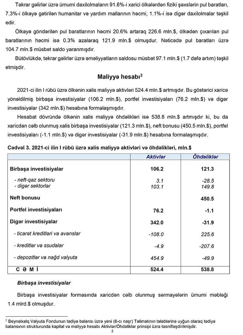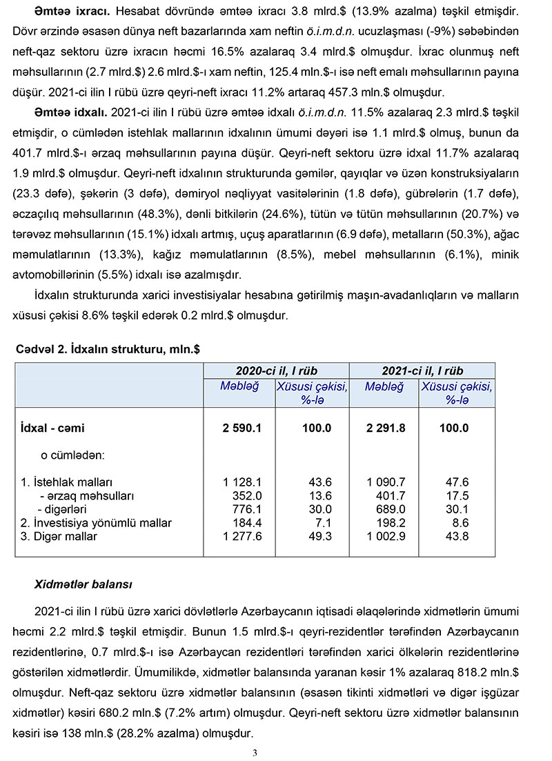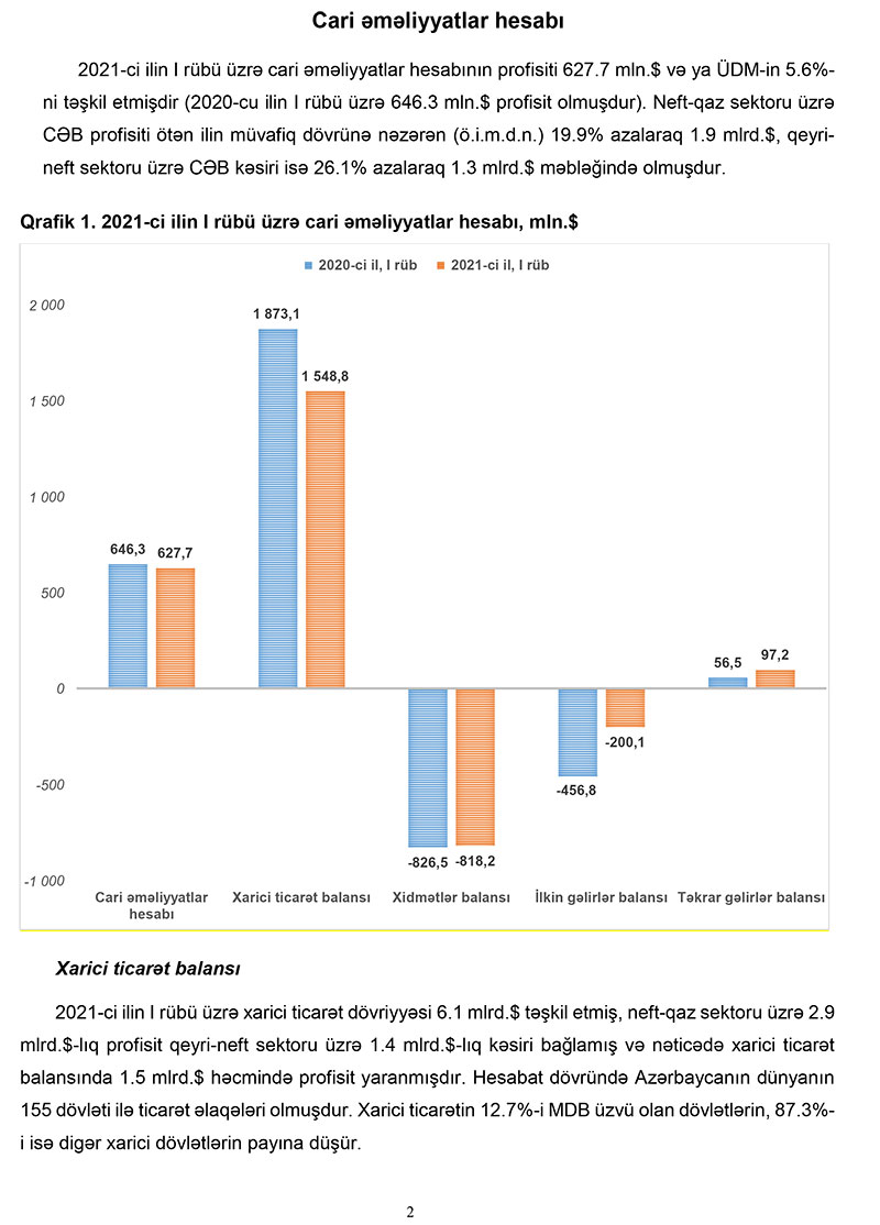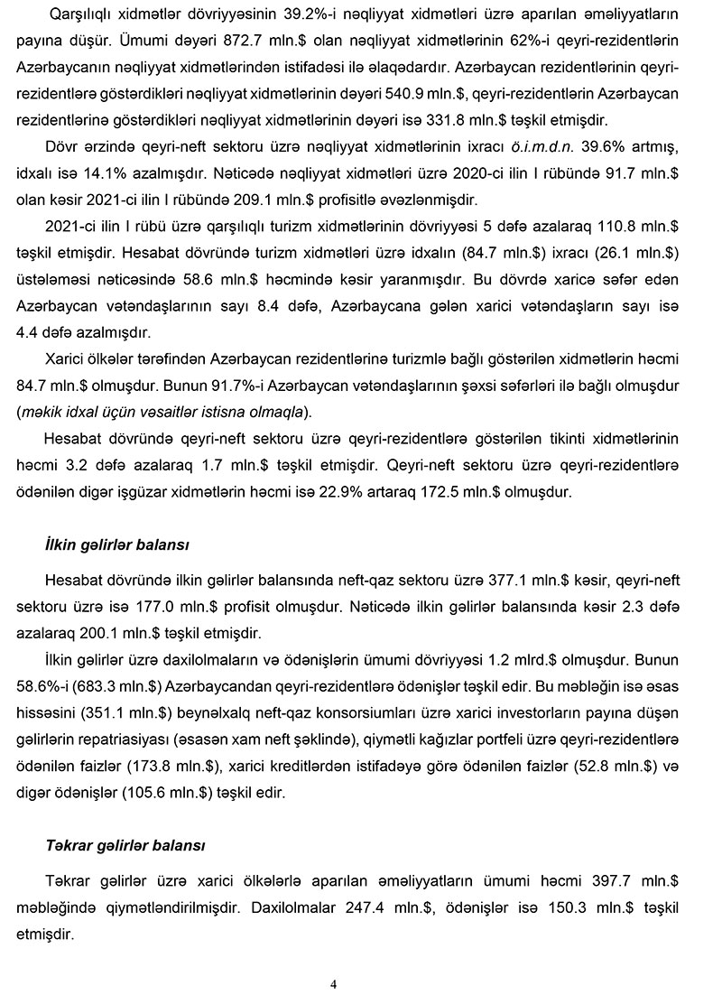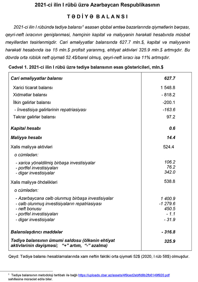 Bu ilin I rübündə Azərbaycanın tədiyyə balansının ümumi qalığı 325,9 milyon ABŞ dolları təşkil edib. Halbuki ötən ilin eyni dövründə tədiyyə balasında 1 milyard 343,5 milyon dollarlıq kəsir yaranmışdı.