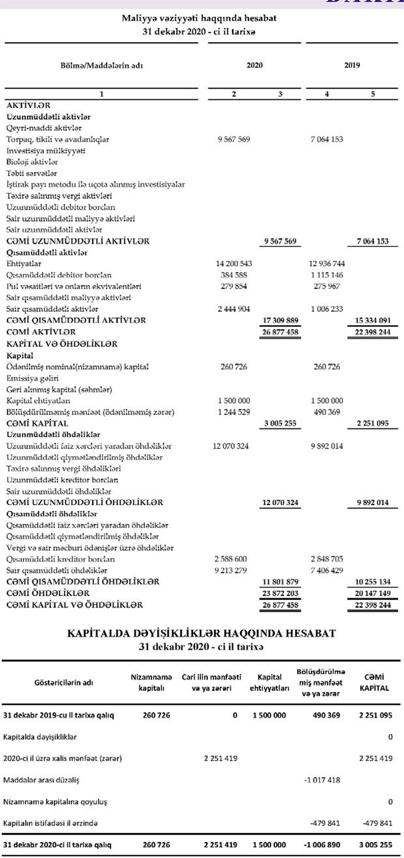 "Bakı İnşaat Sənaye" ASC 2020-ci ili 2 milyon 251 min manat xalis mənfəət ilə başa vurub.