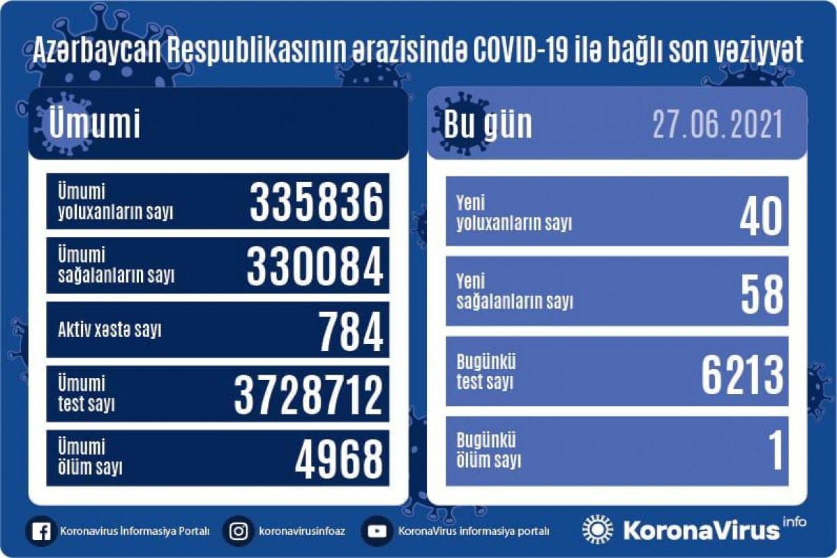Azərbaycan Respublikasında koronavirus (COVID-19) infeksiyasına 40 yeni yoluxma faktı qeydə alınıb, 58 nəfər müalicə olunaraq sağalıb.