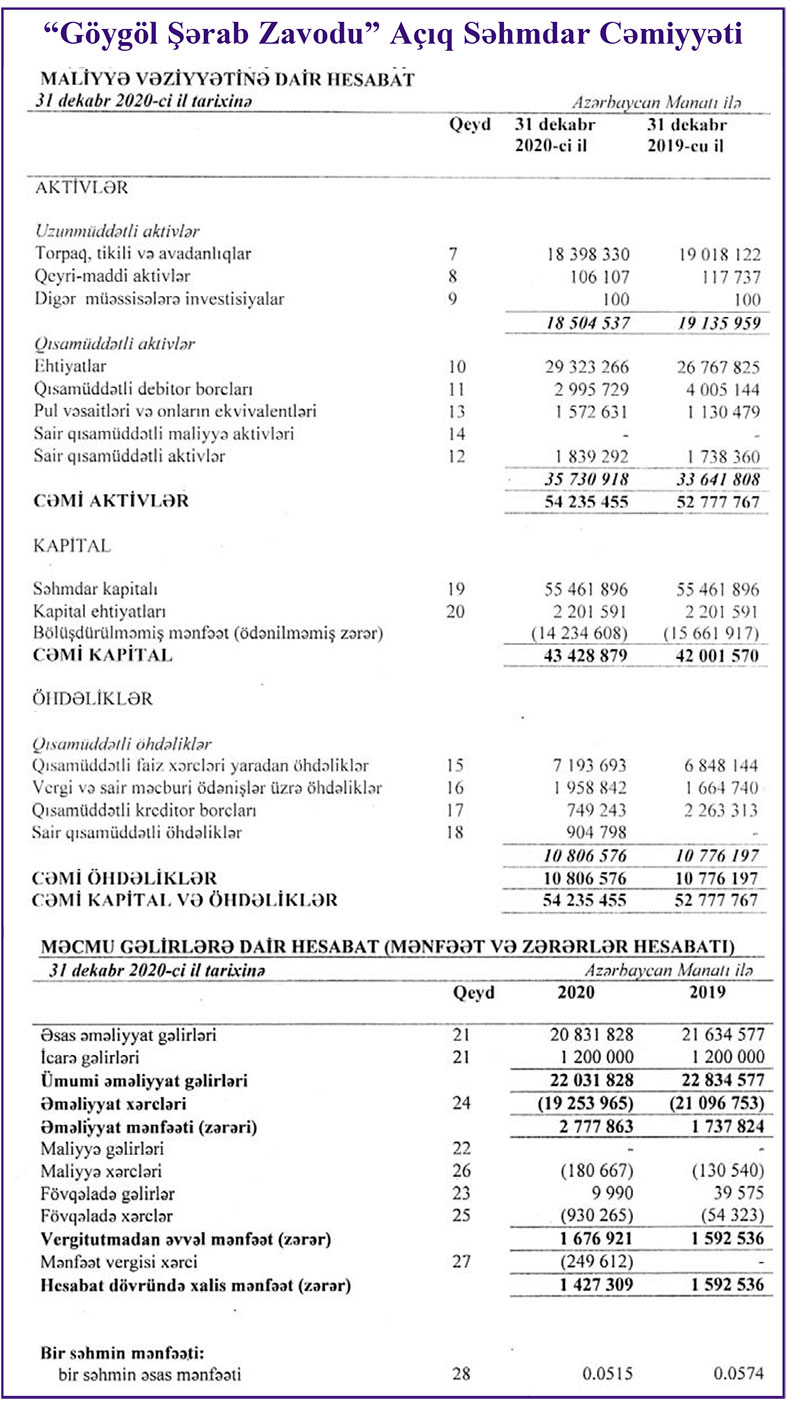 Qeyd edək ki, “Göygöl Şərab Zavodu” ASC 2017-ci ili 5 milyon 16 min manat, 2018-ci ili isə 6 milyon 479 min manat xalis zərər ilə başa vurmuşdu.