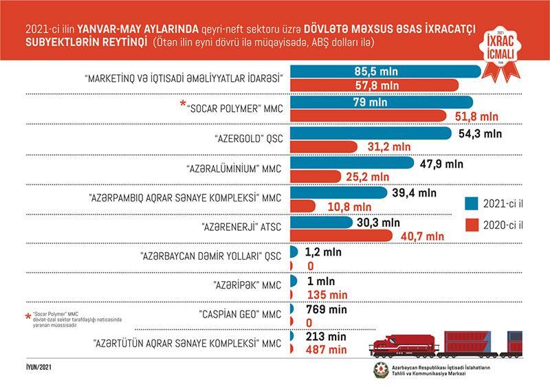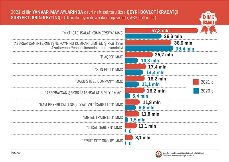 2021-ci ilin yanvar-may ayları üzrə hazırlanan qeyri-dövlət ixracatçı subyektlərin reytinqində ilk onluqda aşağıdakı şirkətlər təmsil olunurlar: "MKT İstehsalat Kommersiya" MMC, "Azərbaycan İnterneyşnl Mayninq Kompani Limited Şirkəti"nin Azərbaycan Respublikasındakı nümayəndəliyi, "P-Aqro" MMC, "Baku Steel Company", "Sun Food" MMC, "Azərbaycan Şəkər İstehsalat Birliyi" MMC, "Ram Beynəlxalq Nəqliyyat və Ticarət LTD" MMC, "Metal Trader LTD" MMC, "Local Garden" və “Fruit city Group” MMC.
