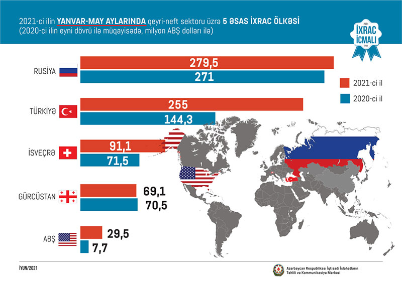 2021-ci ilin yanvar-may ayları ərzində Rusiyaya 279,5 milyon, Türkiyəyə255 milyon, İsveçrəyə 91,1 milyon, Gürcüstana 69,1 milyon və ABŞ 29,5 milyon ABŞ dolları dəyərində qeyri-neft sektoruna aid mal ixrac olunub.