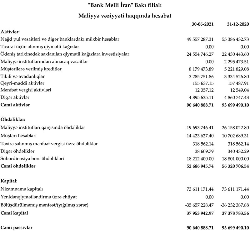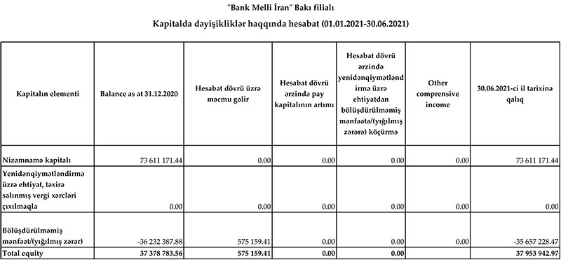 30 İyun 2021-ci il tarixində "Bank Melli İran" Bakı filialı 37 milyon 953 min manat cəmi kapitala malik olub.
