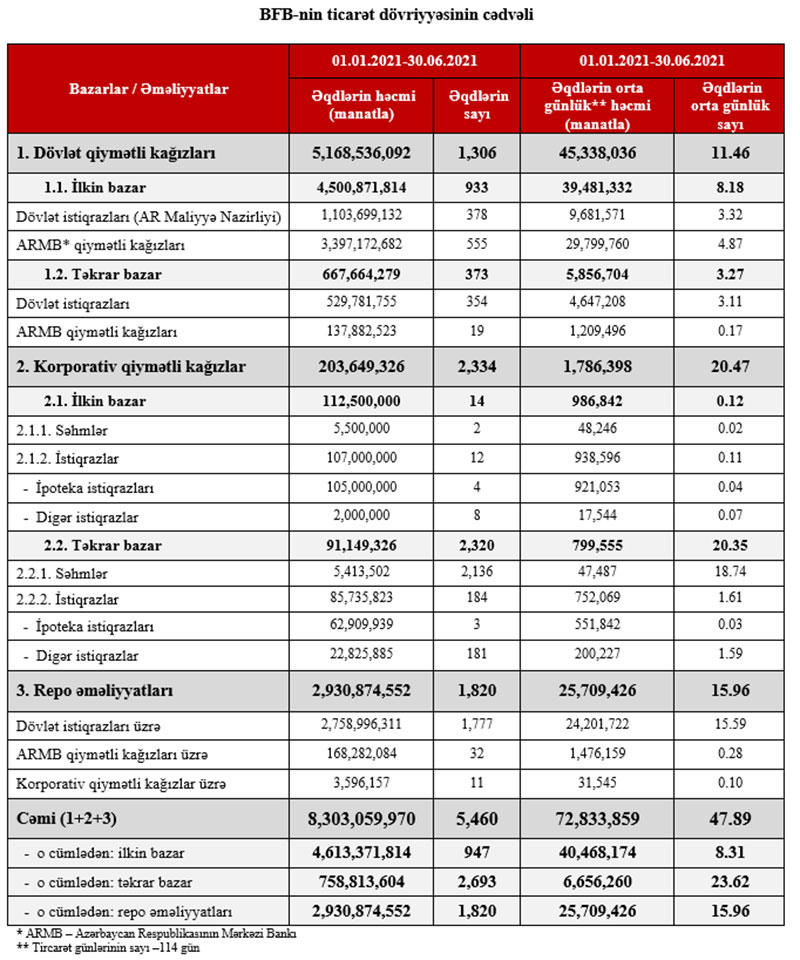 2021-ci ilin ilk 6 ayında dövlət istiqrazları üzrə 4 milyard 392 milyon 477 min manatlıq, Mərkəzi Bankın notları üzrə 3 milyard 703 milyon 289 min manatlıq, ipoteka istiqrazları üzrə 167 milyon 910 min manatlıq əqdlər bağlanıb.