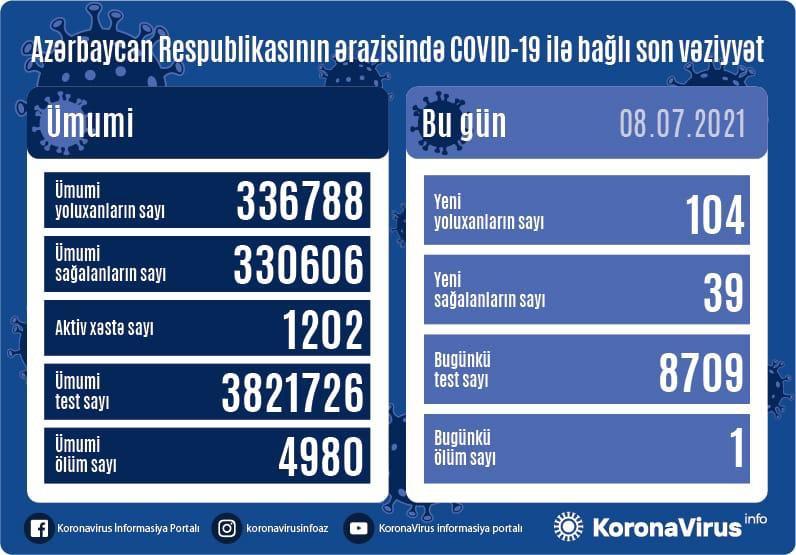 Azərbaycan Respublikasında koronavirus (COVID-19) infeksiyasına 104 yeni yoluxma faktı qeydə alınıb, 39 nəfər müalicə olunaraq sağalıb.