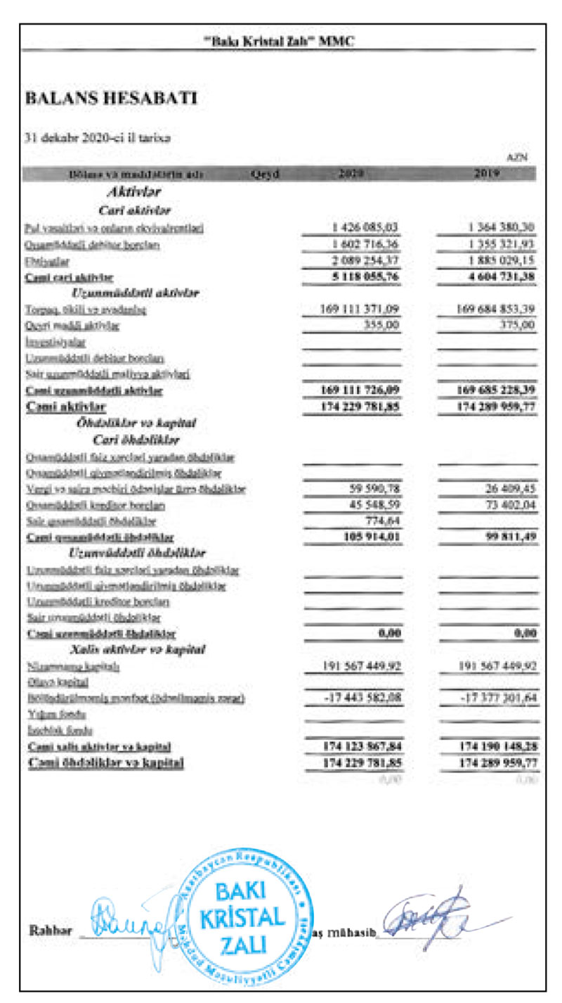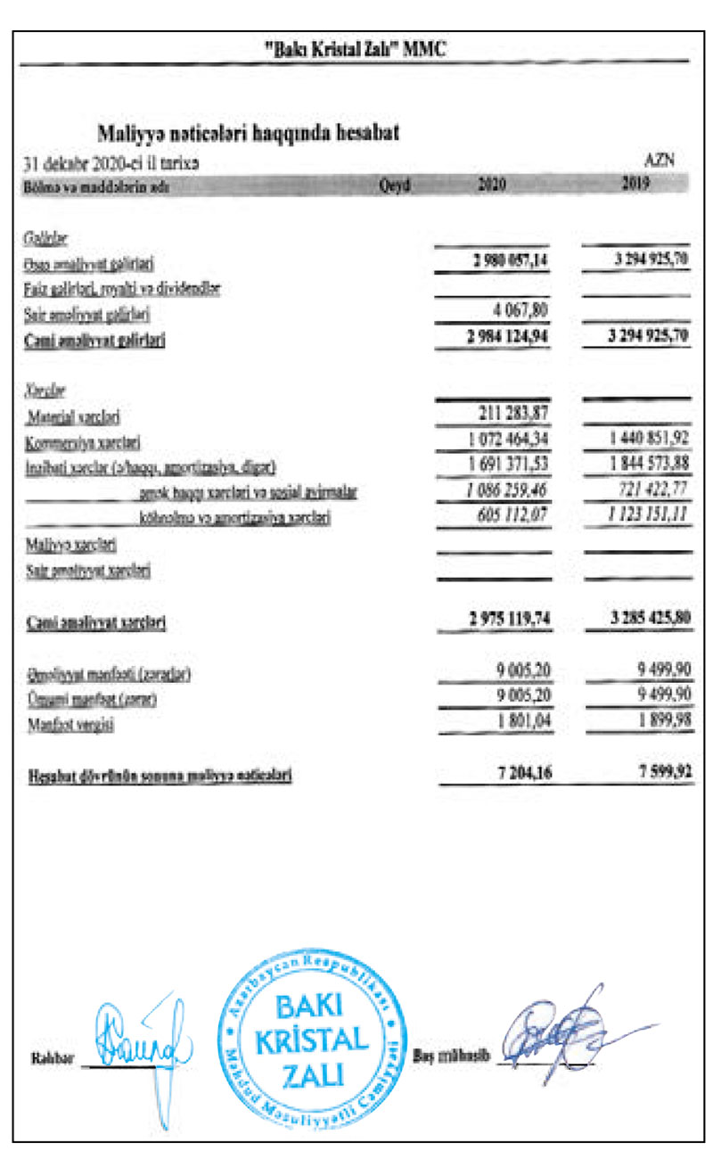 "Bakı Kristal Zalı" MMC 2020-ci ili 7 min 204 manat xalis mənfəət ilə başa vurub. MMC 2019-cu ili 7 min 560 manat xalis mənfəət ilə bağlamışdı.