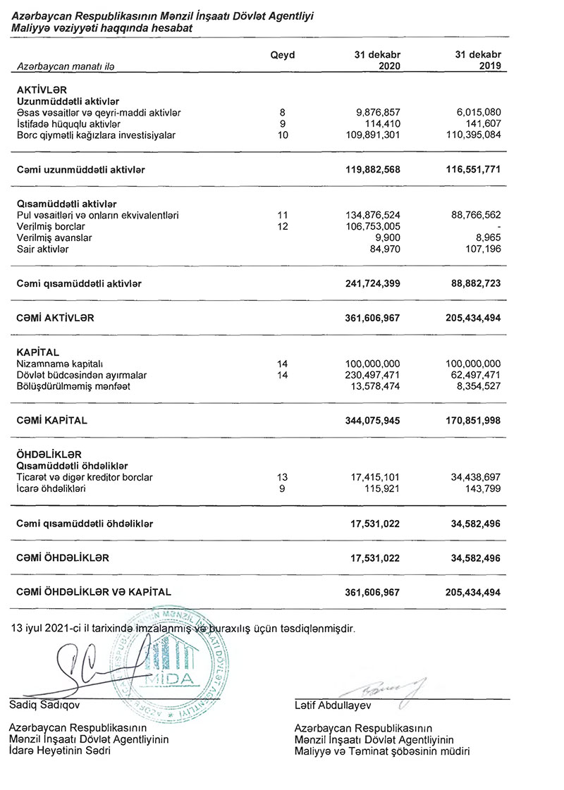 31 Dekabr 2020-ci il tarixində MİDA 361 milyon 606 min 967 manat cəmi aktivlərə malik olub (2019-un sonunda 205 milyon 434 min 494 manat idi ). Aktivlərin artmasına əsasən MİDA tərəfindən qısa müddətə verilmiş borc səbəb olub. 2020-ci ildə Agentlik tərəfindən “MİDA” MMC-yə 110 milyon manat məbləğində faizsiz borc verilmişdir. Bu borc FVTPL kateqoriyasına (Ədalətli dəyərinin dəyişməsi mənfəət və ya zərərdə aid olunan) təsnifləşdirilmiş və 3 milyon 246 min 995 AZN məbləğində zərər il üzrə mənfəət və ya zərərdə qeydə alınmışdır.