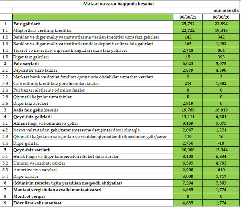 Müqayisə üçün qeyd edək ki, 2020-ci ilin 1-ci yarısında “Rabitəbank”ın cəmi gəlirləri 29 milyon 195 min manat, cəmi xərcləri 19 milyon 919 min manat, əməliyyat mənfəəti 9 milyon 276 min manat təşkil etmiş, ehtiyatlara 7 milyon 503 min manat ayrıldığından həmin dövrü 1 milyon 773 min manat xalis mənfəət ilə bağlamışdı.