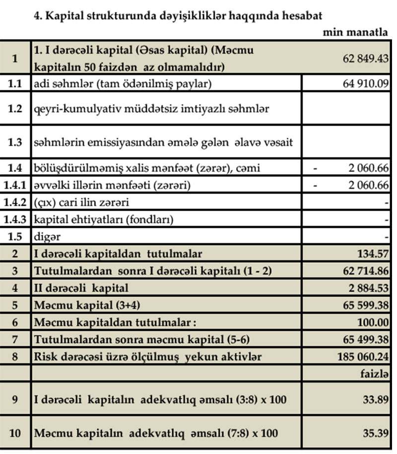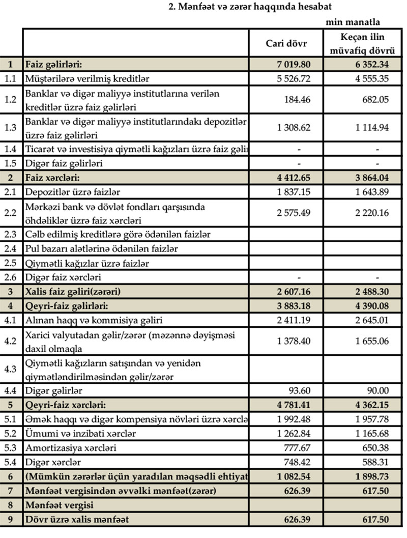 Belə ki, hesabat dövrü üzrə Bank 626,4 min manat mənfəət əldə edib, ilin əvvəlinə nisbətən ümimi aktivləri 14 milyon 402,1 min manat artıb.