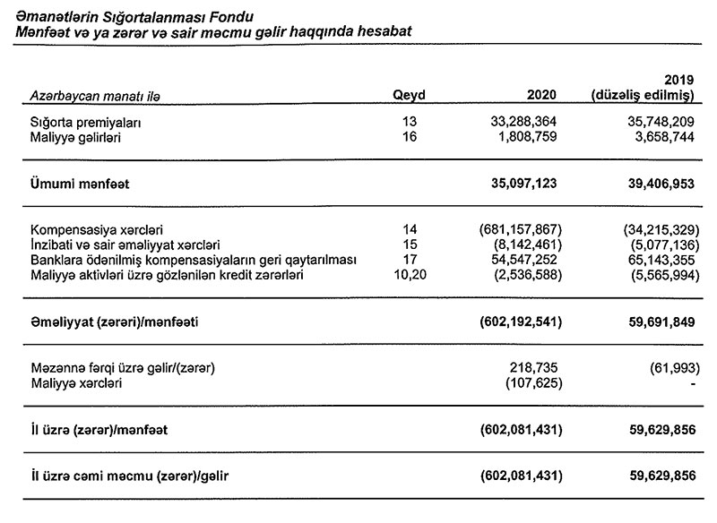 Əmanətlərin Sığortalanması Fondu 2020-ci ili 602 milyon 81 min manat xalis zərər ilə başa vurub. Halbuki, Fond 2019-cu ili 59 milyon 630 min manat xalis mənfəət ilə bağlamışdı.