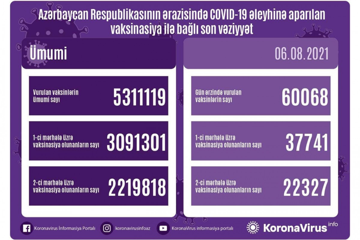 Ölkədə vurulan vaksinlərin ümumi sayı 5311119, birinci mərhələ üzrə vaksinasiya olunanların ümumi sayı 3091301, ikinci mərhələ üzrə vaksinasiya olunanların sayı isə 2219818 təşkil edir.