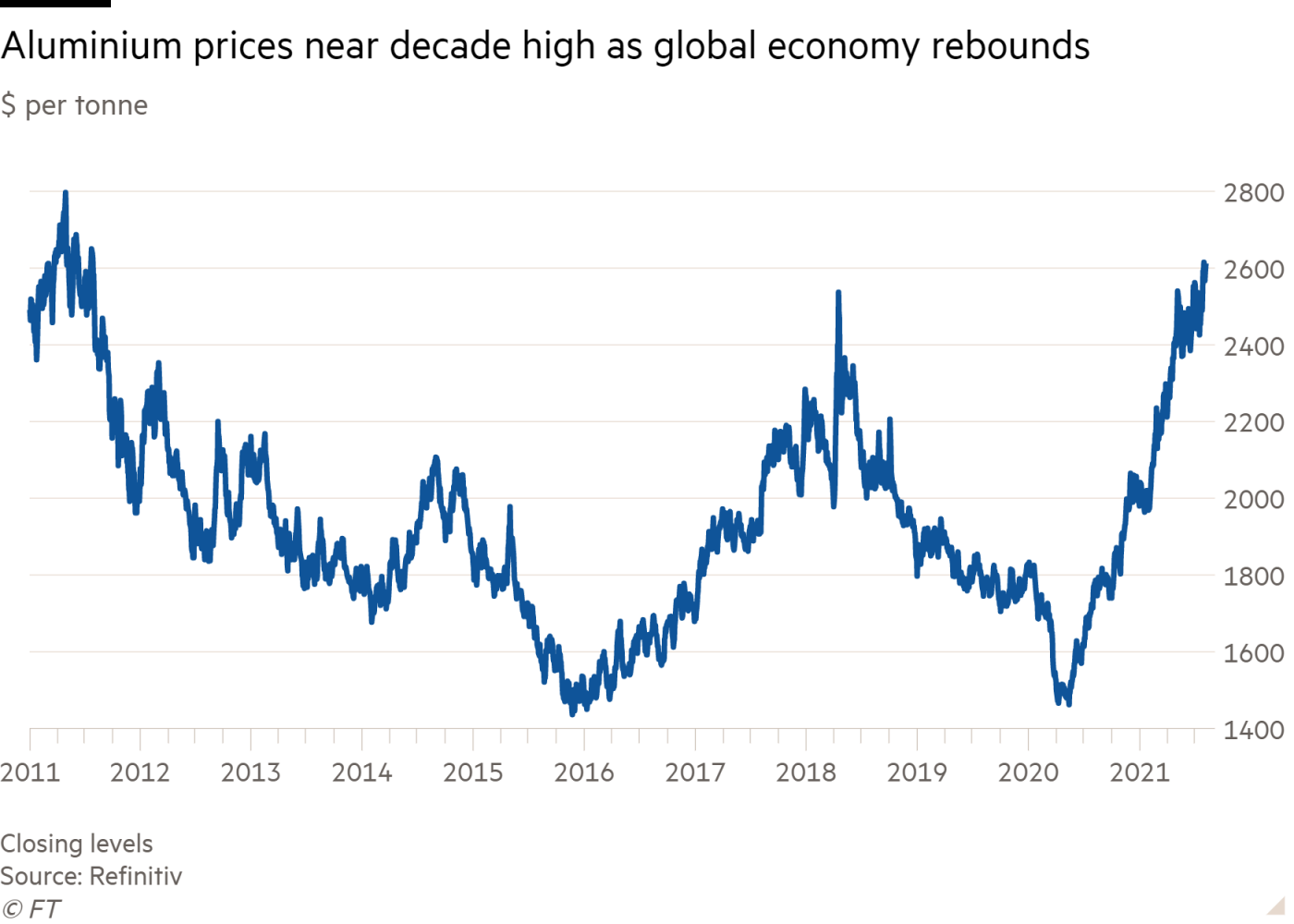 Marja Financial Times-a istinadla xəbər verir ki, 2021-ci ilin əvvəlindən 31% artan alüminium qiymətləri bu həftəni 1 tona görə 2615 dollar qiymətlə başlayıb. Bu isə, son 10 ilin ən yüksək göstəricisidir.