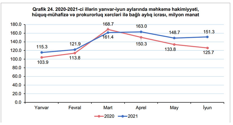 2021-ci ilin yanvar-iyun aylarında dövlət büdcəsinin məhkəmə hakimiyyəti, hüquq-mühafizə və prokurorluq xərcləri 2020-ci ilin müvafiq dövrü ilə müqayisədə 8,2 faiz və ya 65,4 milyon manat artaraq 861,7 milyon manat icra edilmişdir.
