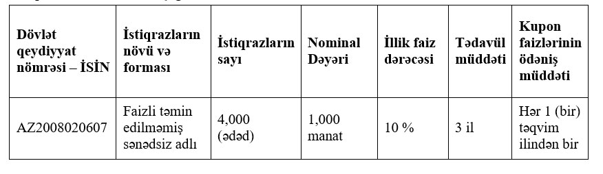 Hər birinin nominal dəyəri 1000 manat, sayı 4000 ədəd, tədavül müddəti 3 il olan istiqrazlar üzrə 10% təklif edilir.
