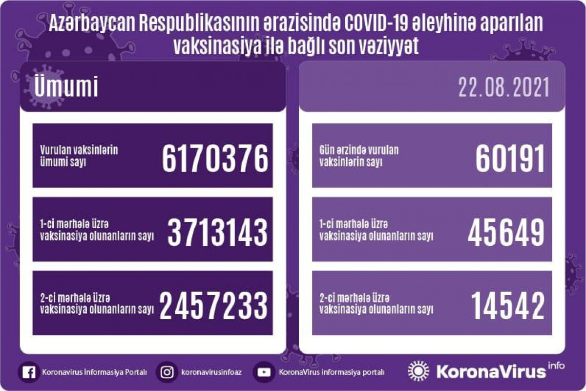 Ölkədə vurulan vaksinlərin ümumi sayı 6 170 376, birinci mərhələ üzrə vaksinasiya olunanların ümumi sayı 3 713 143 , ikinci mərhələ üzrə vaksinasiya olunanların sayı isə 2 457 233 təşkil edir.