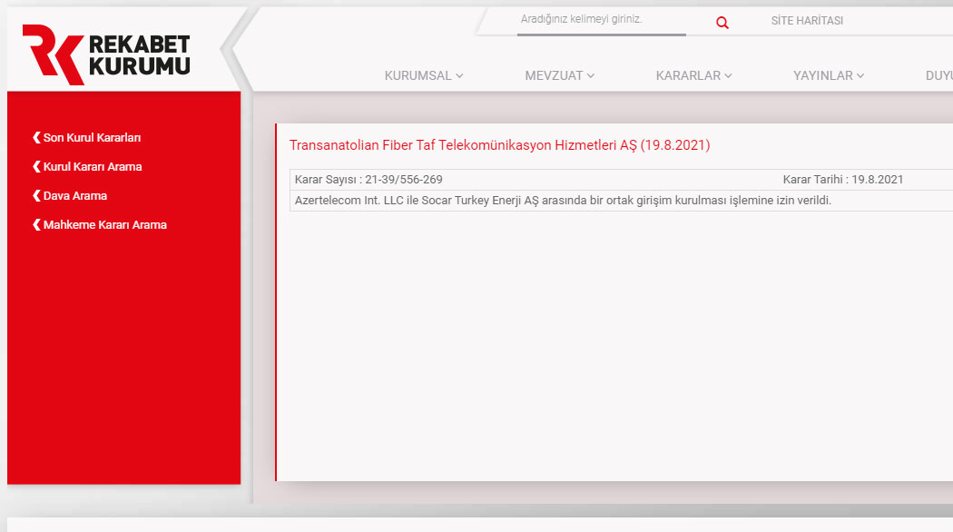 Türkiyənin Rəqabət Təşkilatı tərəfindən, "Azertelecom Int LLC" şirkətilə ilə "SOCAR Turkey Enerji AŞ" şirkəti arasında ortaq şirkət qurulması əməliyyatı da təsdiq edilib.