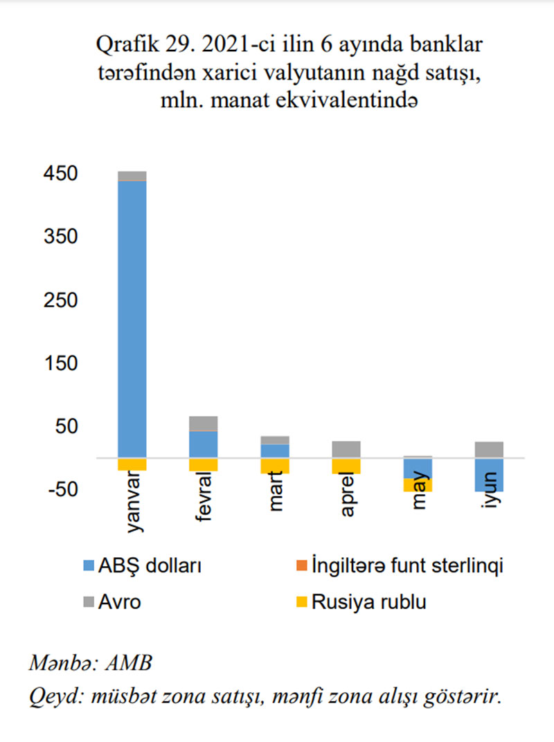 Banklar tərəfindən nağd xarici valyutanın alqı-satqısı üzrə aparılmış əməliyyatların həcmi ötən ilin müvafiq dövrünə nəzərən 42% azalaraq 1,9 milyard ABŞ dolları ekvivalentində olmuşdur. Bunun 84.2%-ni ABŞ dolları ilə aparılmış əməliyyatlar təşkil etmişdir. Nağd valyuta bazarında may və iyun aylarında bankların valyuta alışı satışları üstələmişdir.