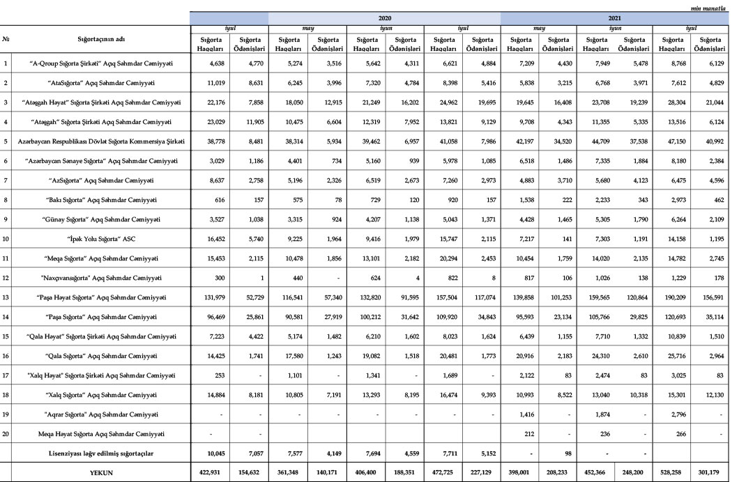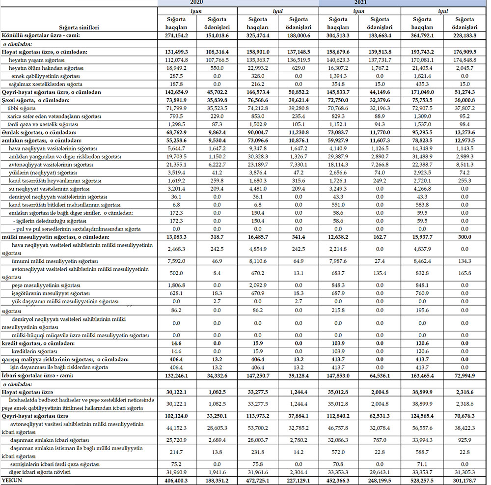 2021-ci ilin yanvar-iyul ayı üzrə hesablanmış sığorta haqları və sığorta ödənişləri (böyütmək üçün üzərinə klikləyin)