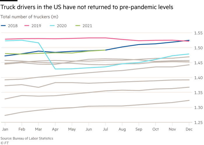 Amerika Yük maşınları Assosiasiyasının məlumatına görə, 2020-ci ilin əvvəlində təkcə ümumi yükdaşımaları həyata keçirən sürücü sayı 465 min nəfər idisə, bu il həmin rəqəm 430 minə qədər azalıb. Böyük Britaniyada isə hazırda 100 min sürücü çatışmır. Bu rəqəmə həm Brexit-dən sonra digər Avropa ölkələrindən olan sürücülərin ölkəni tərk etməsi, həm də koronavirus pandemiyasına görə giriş-çıxış məhdudiyyətlərinin sərtləşdirilməsi təsir edib.