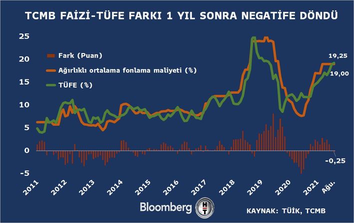 Türkiyədə inflyasiyanın 19%-i aşması ilə, Mərkəzi Bankın faizi ilə inflyasiya fərqi mənfi zonaya keçib.