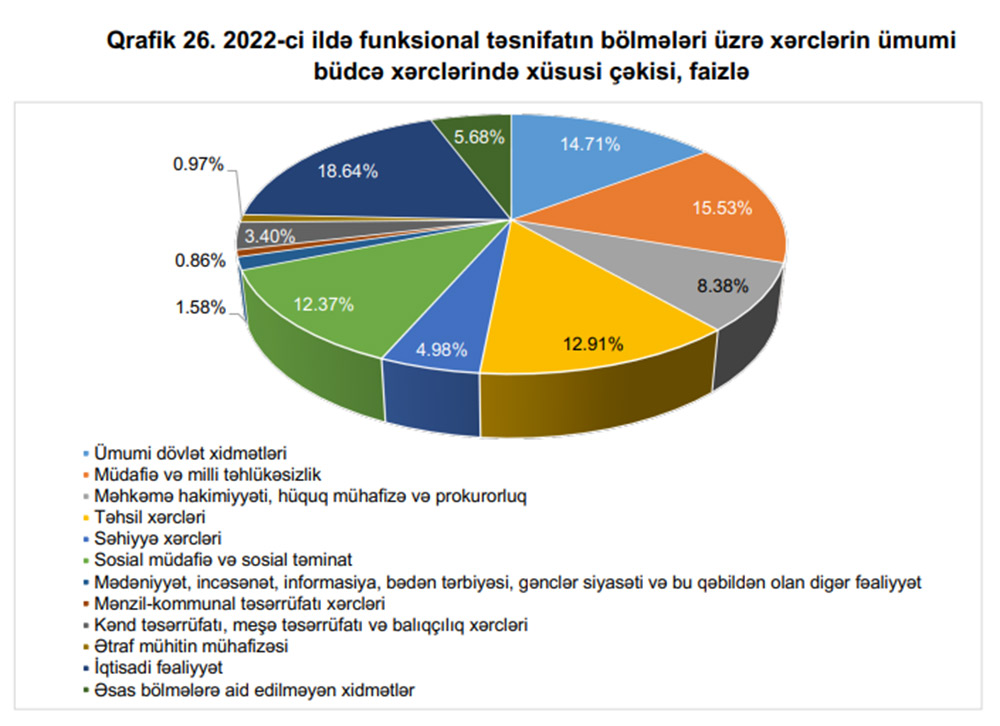 Dövlət büdcəsi xərclərinin funksional təsnifat üzrə strukturunda ən çox paya iqtisadi fəaliyyət (18,64 faiz), müdafiə və milli təhlükəsizlik (15,5 faiz), ümumi dövlət xidmətləri (14,7 faiz), təhsil (12,9 faiz) və sosial müdafiə və sosial təminat (12,4 faiz) xərcləri malik olacaqdır.