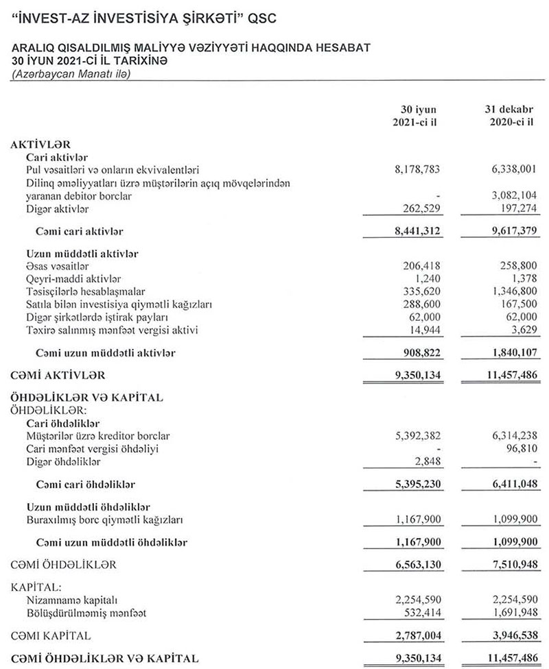 30 İyun 2021-ci il tarixində "İnvest-AZ" şirkəti 9 milyon 350 min manat cəmi aktivlərə, 2 milyon 787 min manat cəmi kapiatala və 6 milyon 563 min manat cəmi öhdəliklərə malik olub.