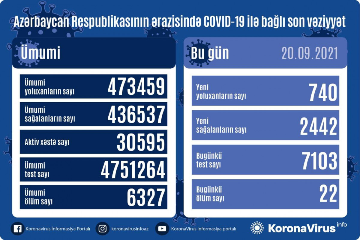 Xatırladaq ki, 19 sentyabr 2021-ci il tarixində 1734 yoluxma faktı və 25 ölüm qeydə alındığı açıqlanmışdı. 13 Dekabr 2020-ci il tarixində açıqlanmış fakt (4451) bugünədək qeydə alınmış ən yüksək günlük yoluxma sayı idi.