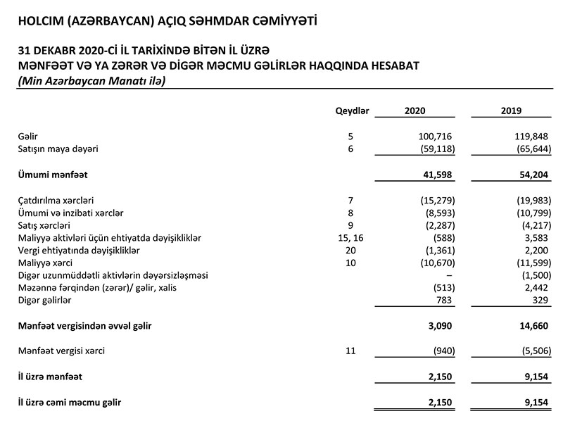 100 milyon manatlıq satışdan 2 milyon 150 min manat qazanc qalıbAzərbaycanda sement istehsalçısı “Holcim Azərbaycan” ASC 2020-ci ili 2 milyon 150 min manat xalis mənfəət ilə başa vurub. Şirkət 2019-cu ili 9 milyon 154 min manat xalis mənfəət ilə bağlamışdı. Beləliklə, ötən il şirkətin xalis mənfəəti 4,3 dəfə azalıb. Mənfəətin azalmasının səbəbləri satışdan gəlirin azalması, ötən il məzənnə fərqi və ehtiyatlarda dəyişikliklər üzrə gəlirlərin olmamasıdır.
