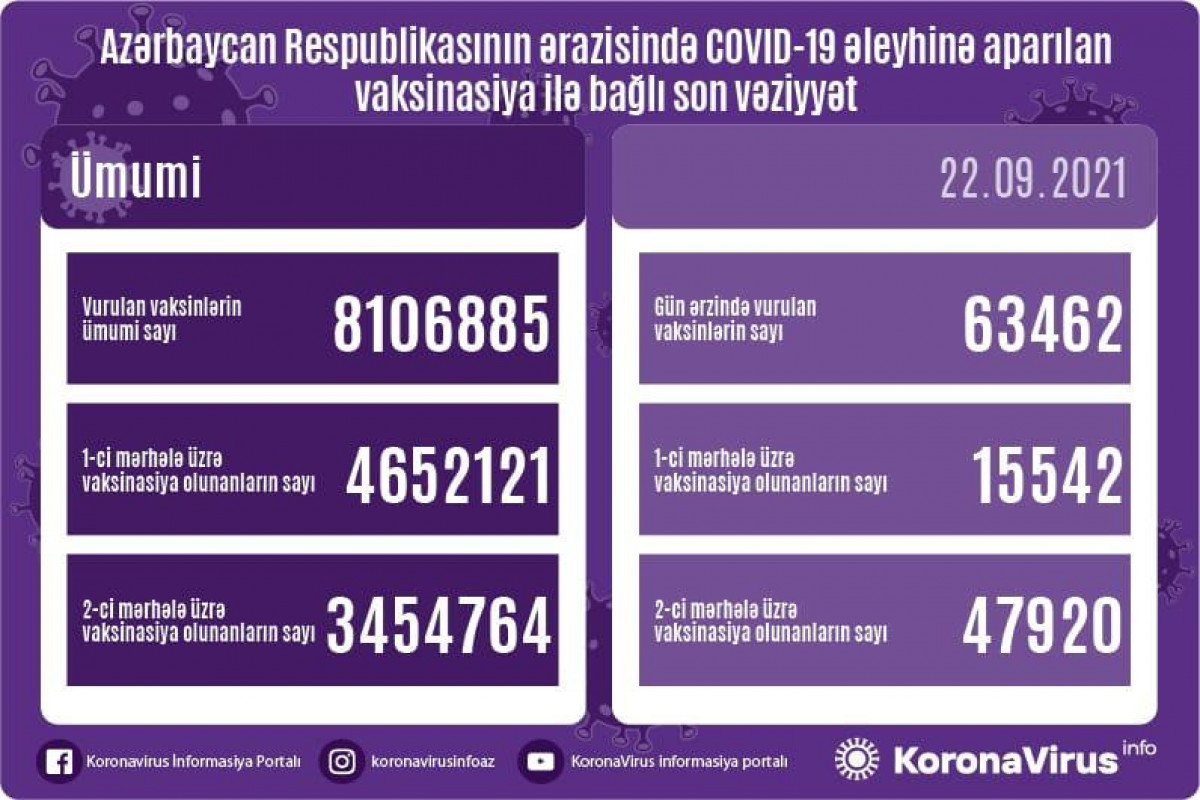 Ölkədə vurulan vaksinlərin ümumi sayı 8 106 885, birinci mərhələ üzrə vaksinasiya olunanların ümumi sayı 4 652 121, ikinci mərhələ üzrə vaksinasiya olunanların ümumi sayı isə 3 454 764 təşkil edir.