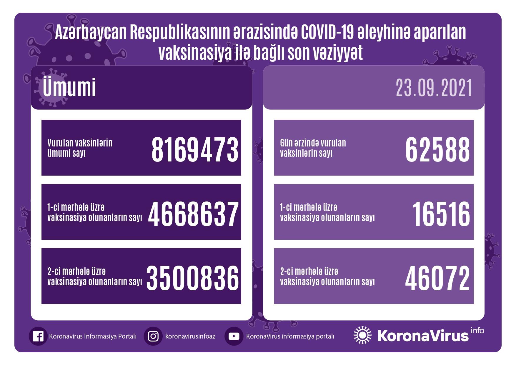 Ölkədə vurulan vaksinlərin ümumi sayı 8169473, birinci mərhələ üzrə vaksinasiya olunanların ümumi sayı 4668637, ikinci mərhələ üzrə vaksinasiya olunanların sayı isə 3500836 təşkil edir.