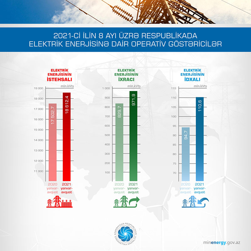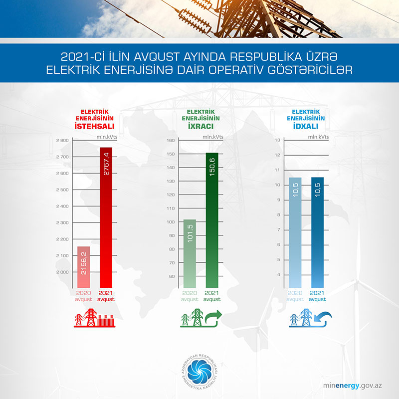 Energetika Nazirliyinin yaydığı məlumata görə, 2021-ci ilin yanvar-avqust ayları üzrə elektrik enerjisinə dair operativ məlumatlara əsasən, avqust ayında respublika üzrə elektrik enerjisinin istehsalı 2767,4 mln. kVt·st, ixracı 150,6 mln. kVt·st, idxalı 10,5 mln. kVt·st olub.
