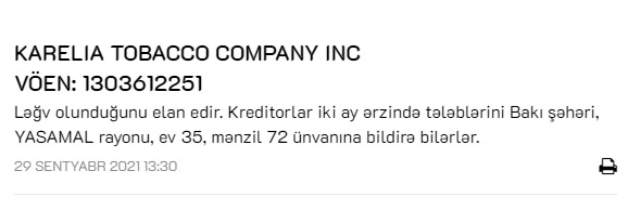 Marja xəbər verir ki, "Karelia Tobacco Company" ləğv olunduğunu elan edib. Kreditorlar iki ay ərzində tələblərini Bakı şəhəri, Yasamal rayonu, ev 35, mənzil 72 ünvanına bildirə bilərlər.