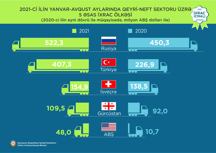 2021-ci ilin yanvar-avqust ayları ərzində Rusiyaya 522,3 milyon ABŞ dolları, Türkiyəyə 407,3 milyon ABŞ dolları, İsveçrəyə 154,9 milyon ABŞ dolları, Gürcüstana 109,5 milyon ABŞ dolları və ABŞ-a 48 milyon ABŞ dolları dəyərində qeyri-neft sektoruna aid mal ixrac olunub.