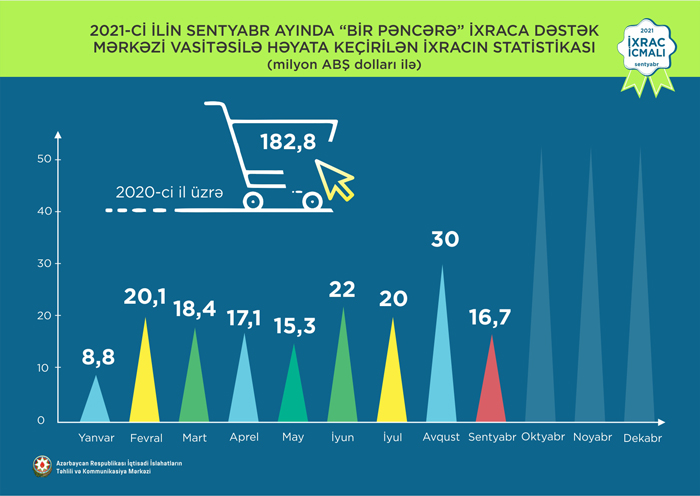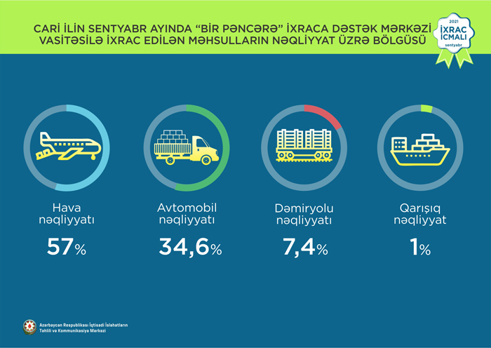 Həmçinin “İxrac İcmalı”nda göstərilib ki, 2021-ci ilin sentyabr ayında “Bir Pəncərə” İxraca Dəstək Mərkəzi vasitəsi ilə həyata keçirilən qeyri-neft ixracının dəyəri 16,7 milyon ABŞ dolları olub. 2017-ci ildən 2021-ci ilin oktyabr ayına qədər “Bir Pəncərə” İxraca Dəstək Mərkəzi vasitəsilə ixrac edilən mal və məhsulların dəyəri 641,7 milyon ABŞ dolları təşkil edib.