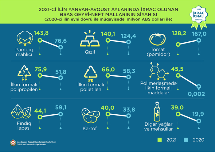 2021-ci ilin yanvar-avqust ayları ərzində ixrac edilən qeyri-neft sektoruna aid malların siyahısında pambıq mahlıcı (143,8 milyon ABŞ dolları) birinci olub. Bu siyahıda qızıl (140,1 milyon ABŞ dolları) ikinci, pomidor (tomat) (128,2 milyon ABŞ dolları) isə üçüncü yerdə qərarlaşıb.