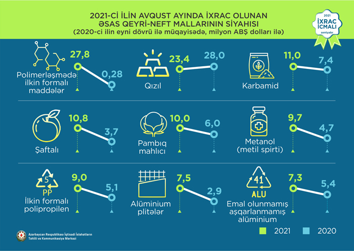 2021-ci ilin avqust ayında ixrac edilən qeyri-neft sektoruna aid malların siyahısında polimerləşmə nəticəsində əmələ gələn ilkin formalı digər maddələr (27,8 milyon ABŞ dolları) birinci, qızıl (23,4 milyon ABŞ dolları) ikinci və karbamid (11 milyon ABŞ dolları) üçüncü olub.