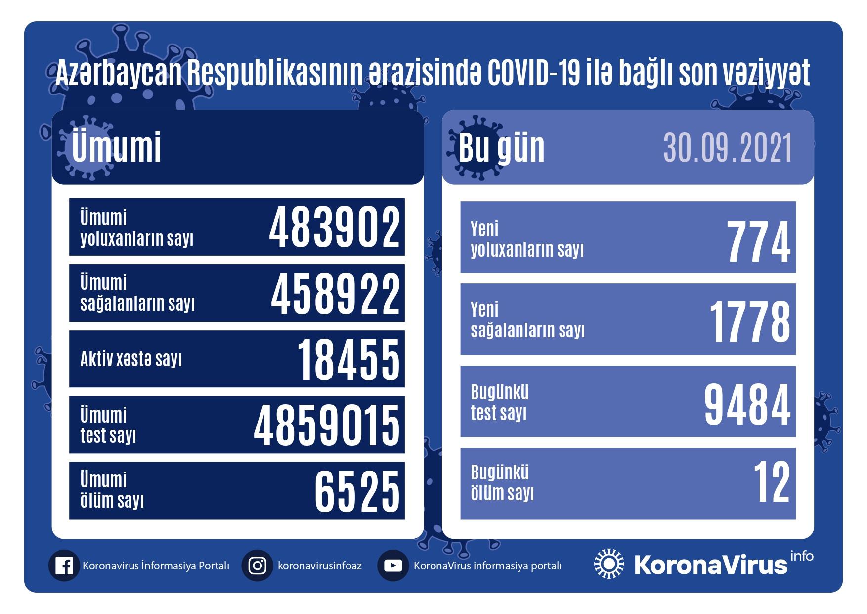 Azərbaycan Respublikasında koronavirus (COVID-19) infeksiyasına 774 yeni yoluxma faktı qeydə alınıb, 1778 nəfər müalicə olunaraq sağalıb.