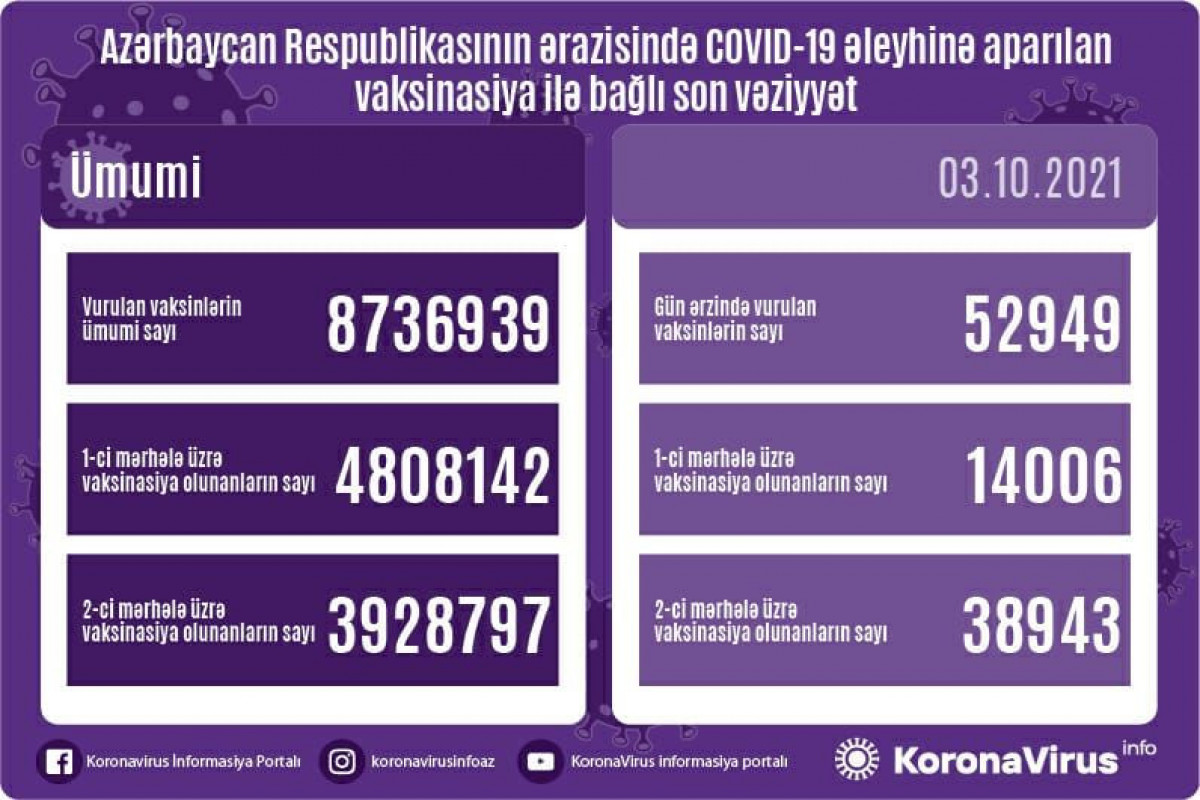 Azərbaycanda son sutkada koronavirus (COVID-19) əleyhinə 52 949 vaksin vurulub.Bir gündə birinci mərhələ üzrə vaksinasiya olunanların sayı 14 006, ikinci mərhələ üzrə vaksinasiya olunanların sayı 38 943 nəfərdir.