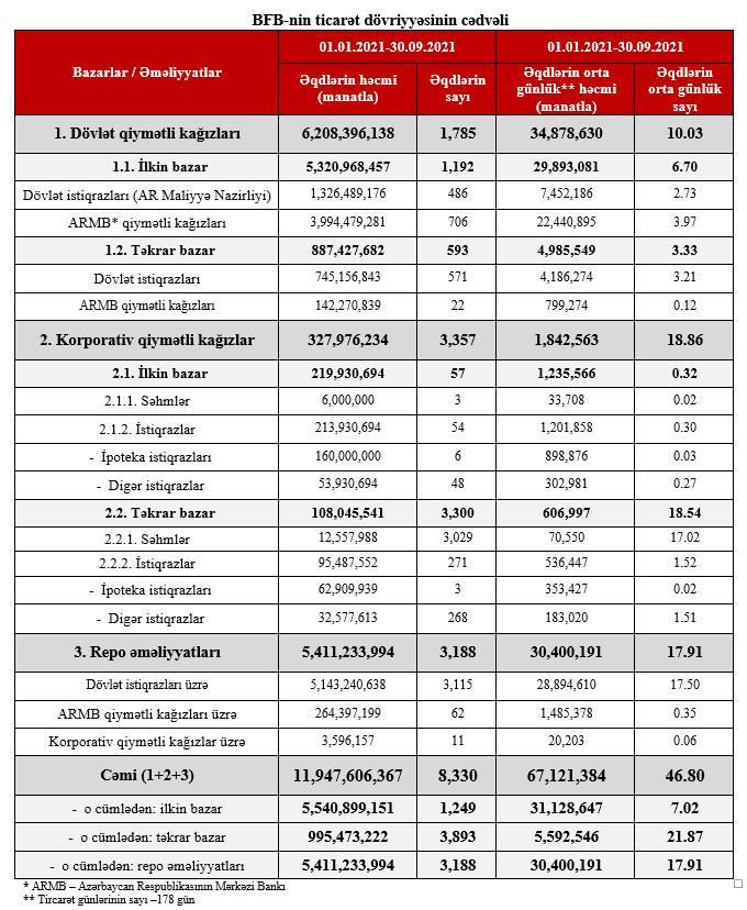 Bakı Fond Birjasında 2021-ci ilin 01.01.2021-30.09.2021 tarixləri ərzində (9 ayda) qiymətli kağızlar üzrə keçirilən əməliyyatların ümumi həcmi 11 milyard 947 milyon 606 min 367 manat təşkil edib.