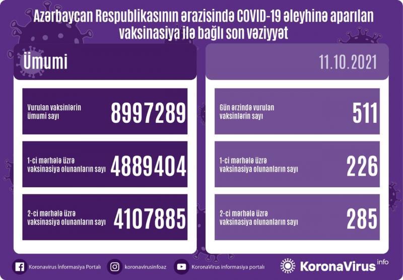 Azərbaycanda son sutkada koronavirus (COVID-19) əleyhinə 511 vaksin vurulub. Bir gündə birinci mərhələ üzrə vaksinasiya olunanların sayı 226, ikinci mərhələ üzrə vaksinasiya olunanların sayı 285 nəfərdir.