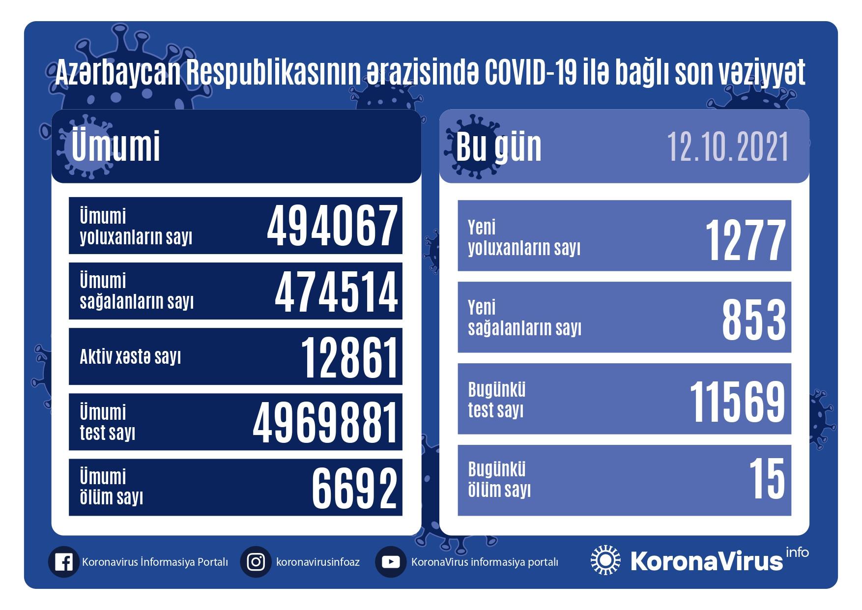 Azərbaycanda ötən sutka koronavirus (COVID-19) infeksiyasına 1277 yeni yoluxma faktı qeydə alınıb, 853 nəfər müalicə olunaraq sağalıb.