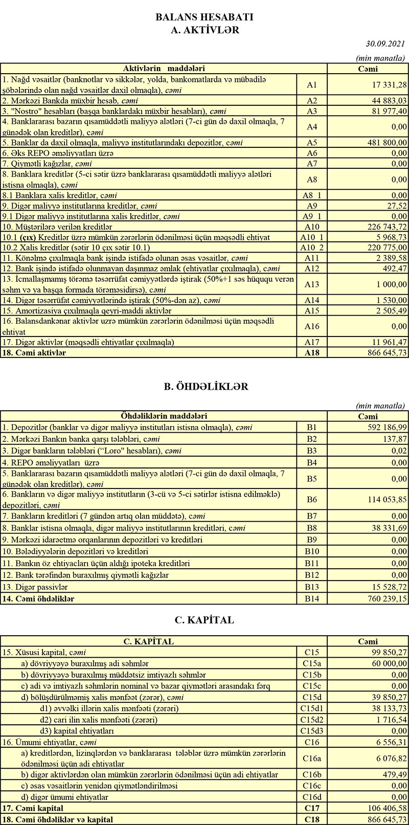 O cümlədən, Bankın 9 aylıq faiz gəlirləri 3 milyon 876 min manat və ya 15,6% azalaraq 20 milyon 920 min manata düşüb, qeyri-faiz gəlirləri isə 116 min manat artaraq 4 milyon 172 min manata yüksəlib.