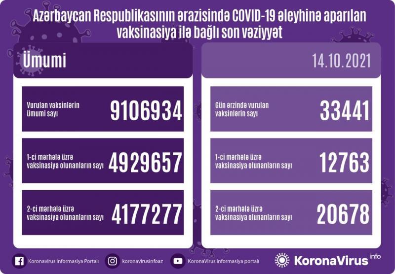 Ölkədə vurulan vaksinlərin ümumi sayı 9 106 934, birinci mərhələ üzrə vaksinasiya olunanların ümumi sayı 4 929 657, ikinci mərhələ üzrə vaksinasiya olunanların sayı isə 4 177 277 təşkil edir.