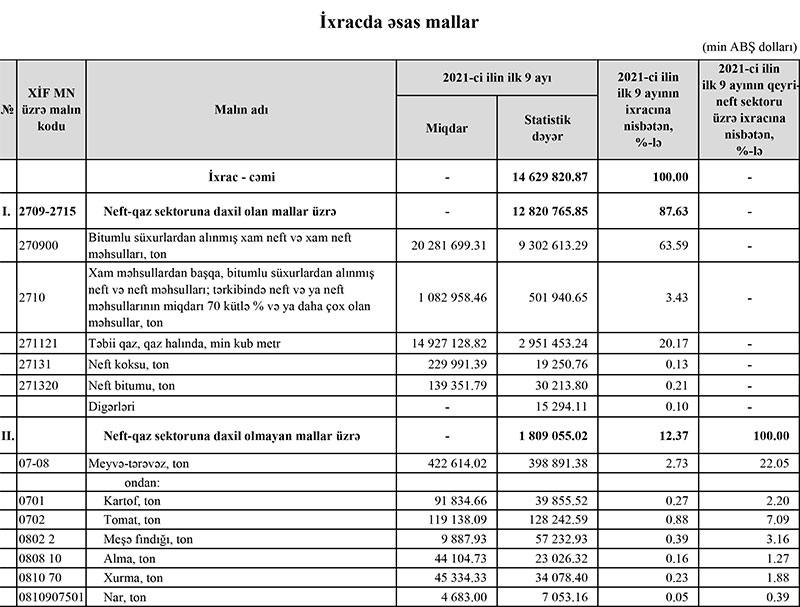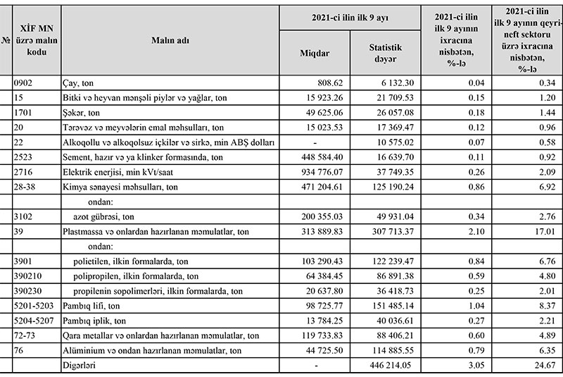 2021-ci ilin yanvar-sentyabr aylarında Azərbaycanın ən çox ixrac və idxal etdiyi mallar açıqlanıb.