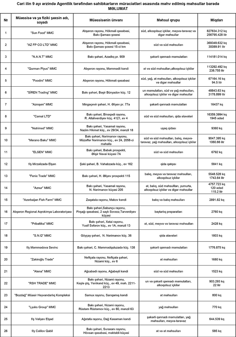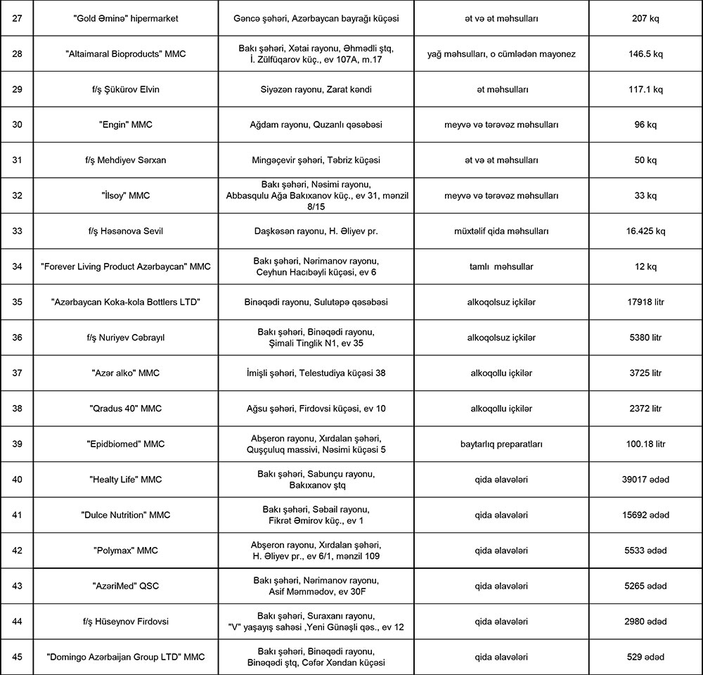 Müddəti bitmiş və yararsız məhsulları məhv edilmiş şirkətlərin siyahısı açıqlanıb